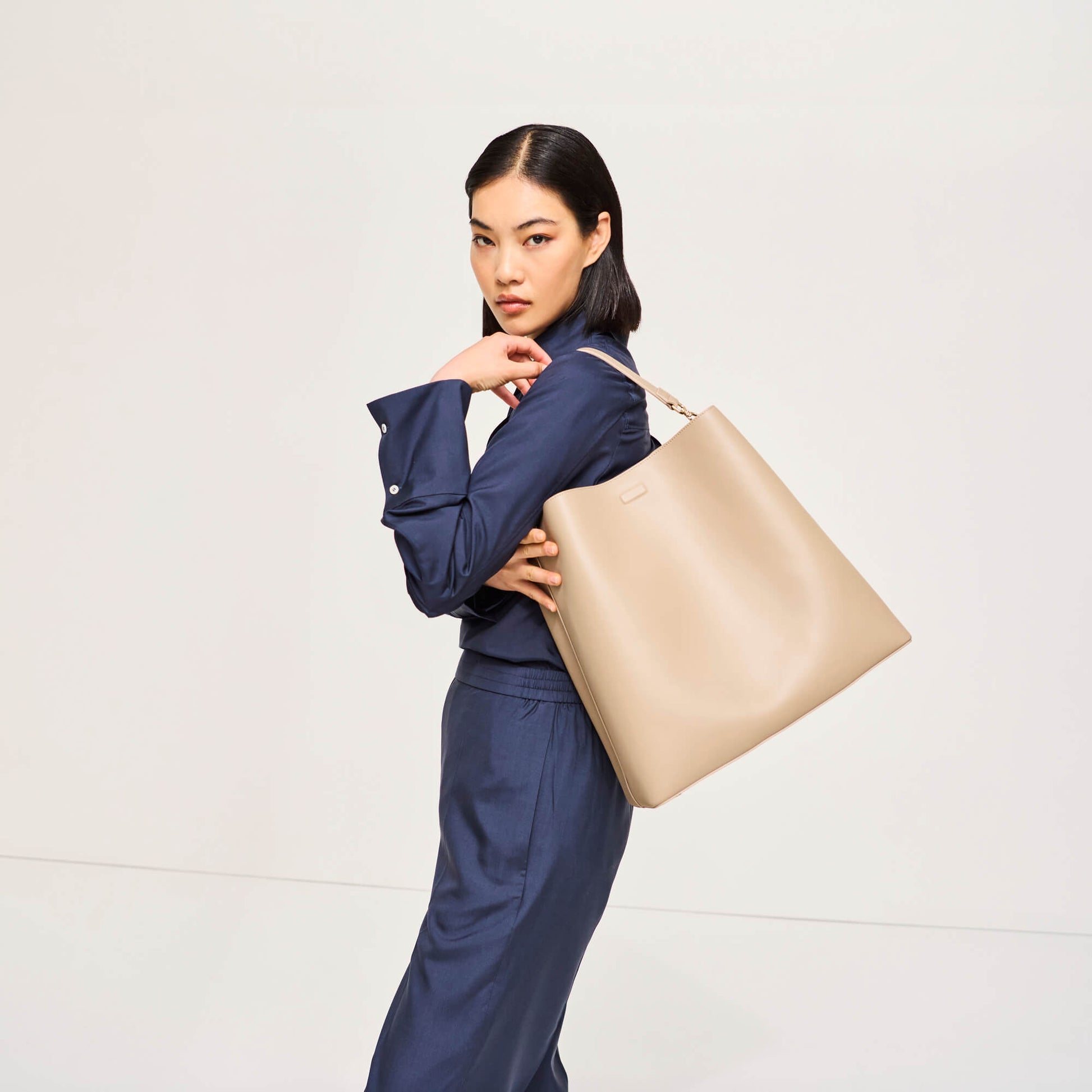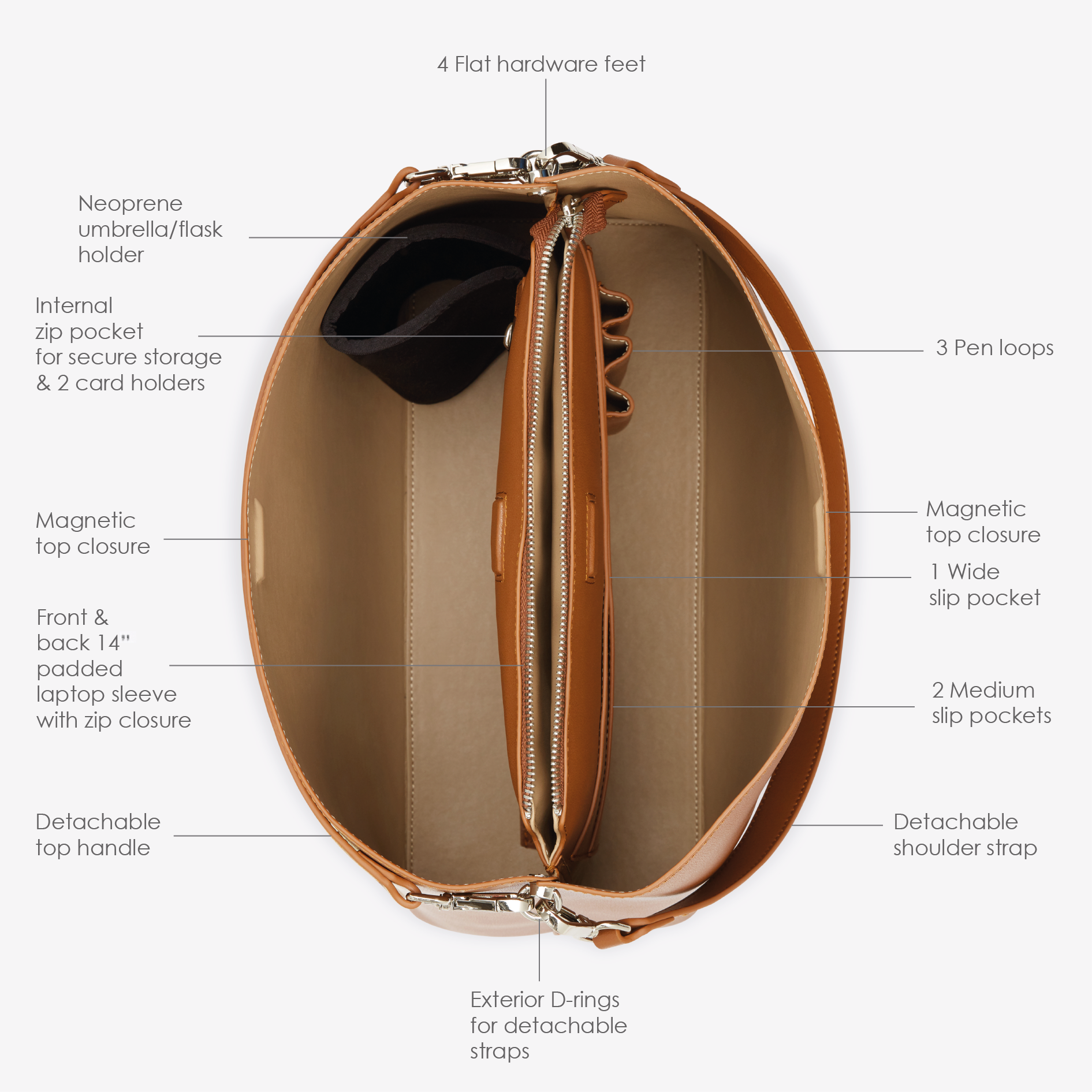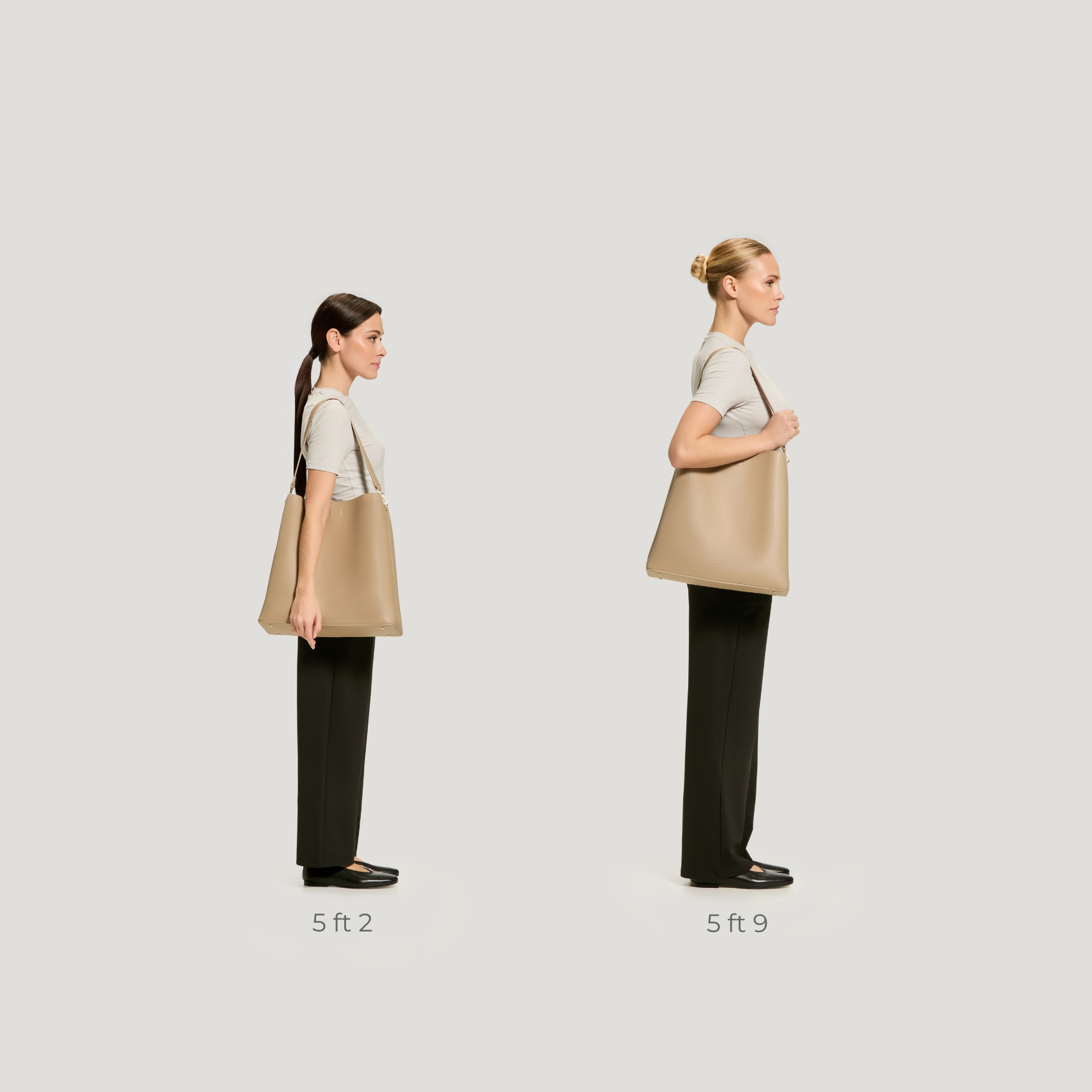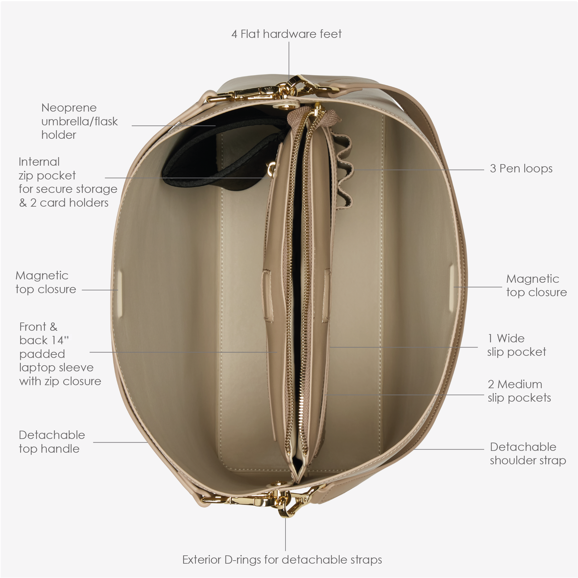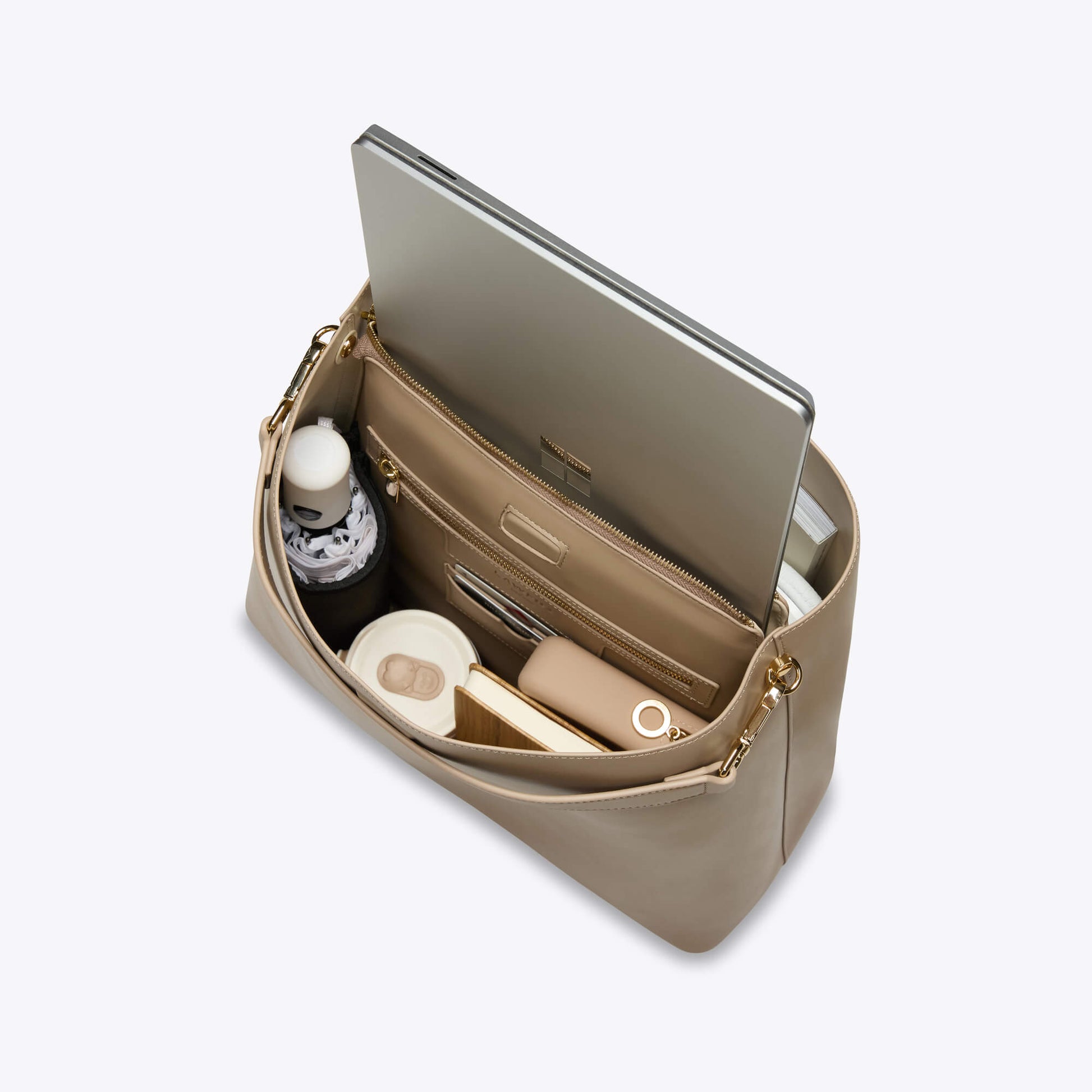 Perfectly sized to hold a laptop, charger, A4 documents, gym kit, shoes, lunch box, water bottle, and more—without losing its elegant shape.